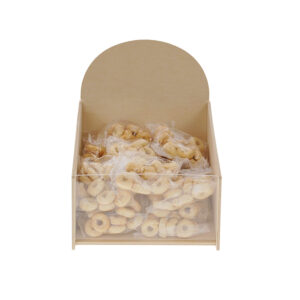 Espositore e contenitore da banco in legno con facciata frontale in plexiglass utilizzato per esporre prodotti da forno come taralli e biscotti, prodotti alimentari imbustati, prodotti tipici, pasta.